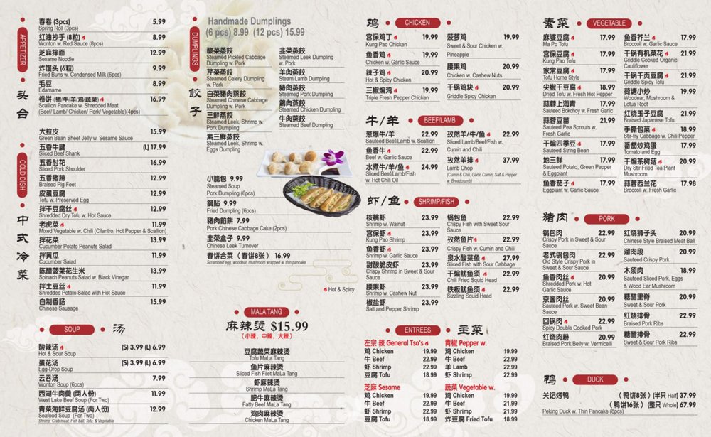 “ We had been debating going here for several months as it's near to his gym which I walk him to fairly regularly and always pass by this place. Finally checked it out last night for an early dinner. Like really early. Like we got there at a quarter to five and we were the first people to come inside which is an apprehensive moment in dining but more people showed up later on. I think this is Northern Chinese food. They present the menu with a plethora of pictures which I appreciate but it makes it also difficult to decide on what to order because everything is kind of just randomly scattered on twenty pages of pictures. Also, I found out after the fact that the take-out menu is a little different. Easier to follow with everything categorized and a larger selection of noodle dishes. Alot of the meat dishes and more traditional Northern Chinese cuisine dishes are fairly on the expensive side. I'm not splurging on a $36 pot of stew or $20-25 of chicken or beef. But there was some wiggle room. Most of the dumplings are under $10 as well as a lot of other appetizers. We ultimately went with an order of spring rolls (you get 3) and that's kind of nice because I've been charged before like $4 per spring or eggroll and that hurts. These were quite flavorful and burned my mouth off in excitement. We also went with the wonton soup and the pork soup dumplings for appetizers. Wonton soup was a very generous serving and I liked the element that they added some seaweed into it. The pork soup dumplings were flavorful and had a copious chunk of pork in them but there was almost no soup. None. Nada. Zilch. If you told me these were steamed pork dumplings I would have believed you more than that they were soup dumplings. The skin was correct and delicate and well done. Just sad that they couldn't fill them. I still ate them though. If I come back I want to try the steamed lamb dumplings. For our entrees we pretty much got the same thing but different. He went with the braised beef noodle soup and I went with the pork rib noodle soup. We were really on a soup roll last night. I was going to to go with the beef but kind of glad I went pork. I liked his broth more. It was spicy and a had a kick to it. But the beef was super fatty. Even more fatty than my rib meat which was falling off the bone succulent. Fan. The noodles were okay. They could have used a chewier texture to them or some bite but they were just meh. I enjoyed the bok choy added inside. Health. Anyway, I have leftovers for lunch this week which I'm happy about. Different than our usual Chinese spots in the area but it was a nice change. They apparently do free delivery orders over $15 and have pretty good lunch deals but that's for only on week days sadly. Service was pretty good so I don't know what the other reviews are talking about and it definitely does not smell like piss in here. It was very clean and had pleasant aesthetics. ”